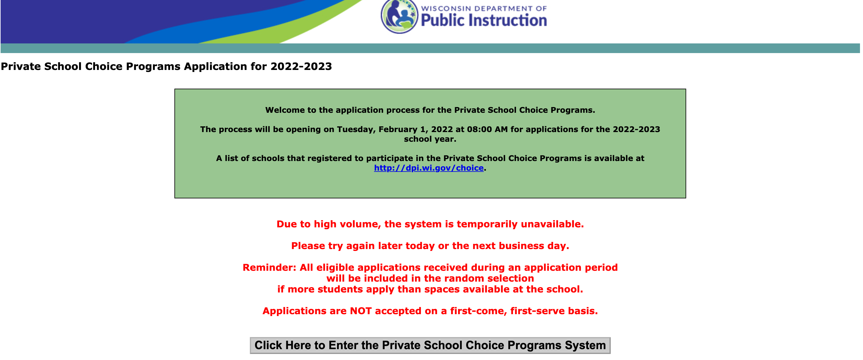 If a parent or a school administrator logged on to OAS on February 1st or 2nd, the first few days of the statewide, Milwaukee, and Racine enrollment period, they were met with a red-lettered message from DPI saying “Due to the high volume, the system is temporarily unavailable. Please try again later today or the next business day.”