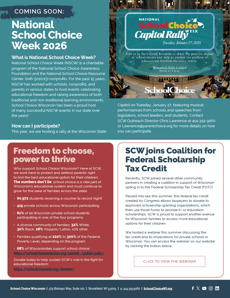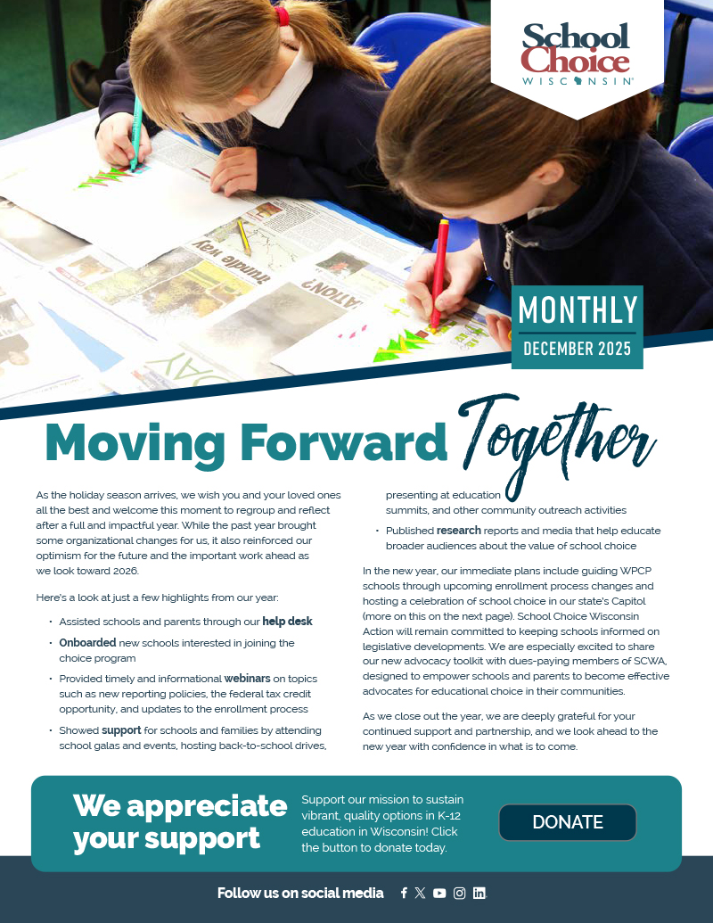Download School Choice Wisconsin’s latest newsletter: SCW Monthly – November 2025, Volume 15.